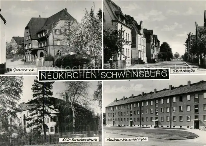 AK / Ansichtskarte Neukirchen_Schweinsburg Sparkasse Poststrasse Neubau Hauptstrasse SED Sonderschule