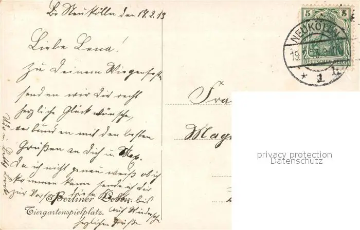 Neukoelln Berliner Tiergartenspielplatz Neukoelln postalisch gelaufen 1913 Erhaltung siehe scans [WerneD78] WernPID7