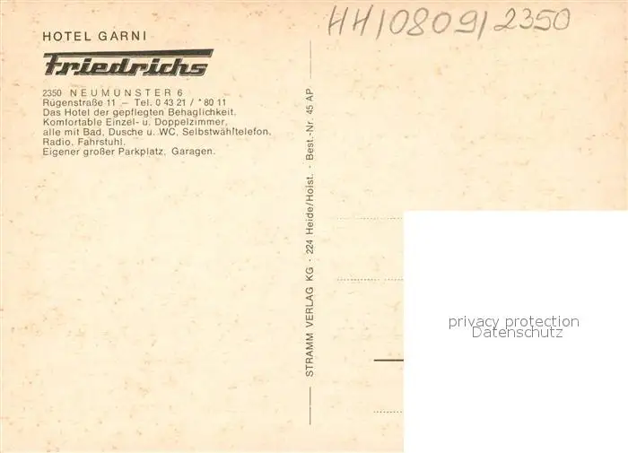 Neumuenster_Schleswig-Holstein Hotel Garni Friedrichs Neumuenster postalisch nicht gelaufen nach 1965 Erhaltung siehe scans [LiesaD40] LiesID40