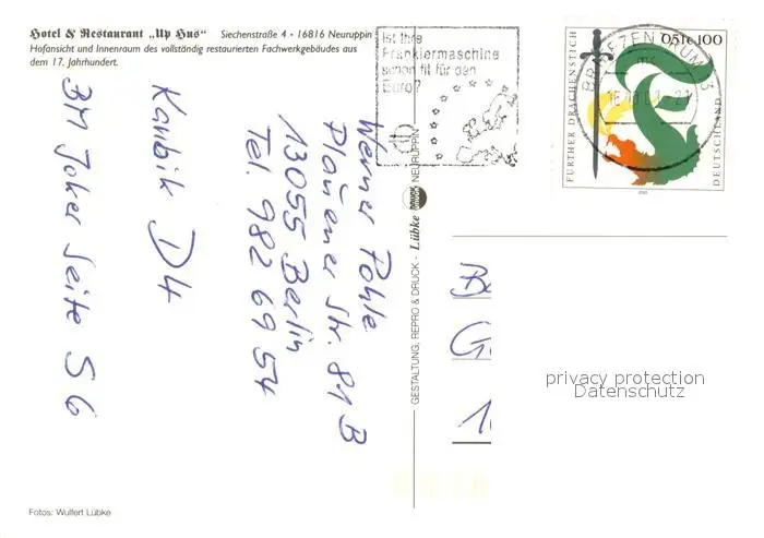 Neuruppin Hotel Restaurant Up Hus Fachwerkhaus 17. Jhdt. Neuruppin postalisch gelaufen 2001 Erhaltung siehe scans [FriedD77] Frierer
