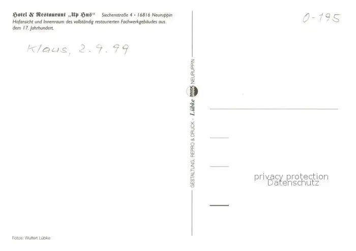 Neuruppin Hotel Restaurant Up Hus Neuruppin postalisch nicht gelaufen 1999 Erhaltung siehe scans [LiesaD40] LiesID40