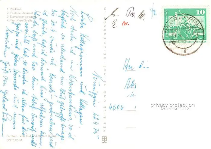 Neuruppin Poliklinik Fontane Denkmal Dampferanlegestelle Karl Marx Strasse Neuruppin postalisch gelaufen 1975 Erhaltung siehe scans [FriedD77] Frierer
