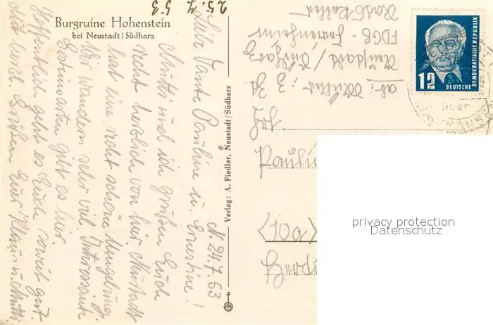 Neustadt_Harz Burgruine Hohenstein Neustadt_Harz postalisch gelaufen 1953 Erhaltung siehe scans [FriedD77] Frierer