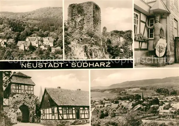 AK / Ansichtskarte Neustadt_Harz Panorama Ruine Statue Stadttor Panorama Neustadt_Harz