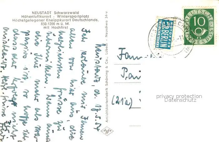 Neustadt_Schwarzwald Hochfirst Neustadt_Schwarzwald postalisch gelaufen 1954 Erhaltung siehe scans [NatalD47] NataID47