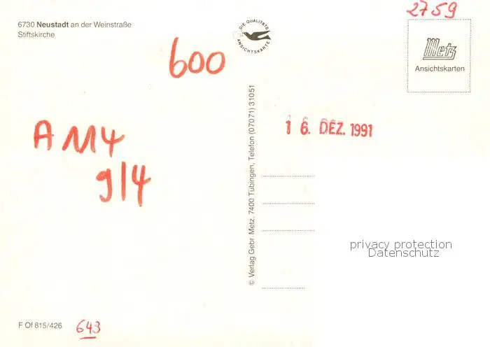 Neustadt_Weinstrasse_Haardt Stiftskirche postalisch nicht gelaufen nach 1965 Erhaltung siehe scans [WerneD78] WernPID7