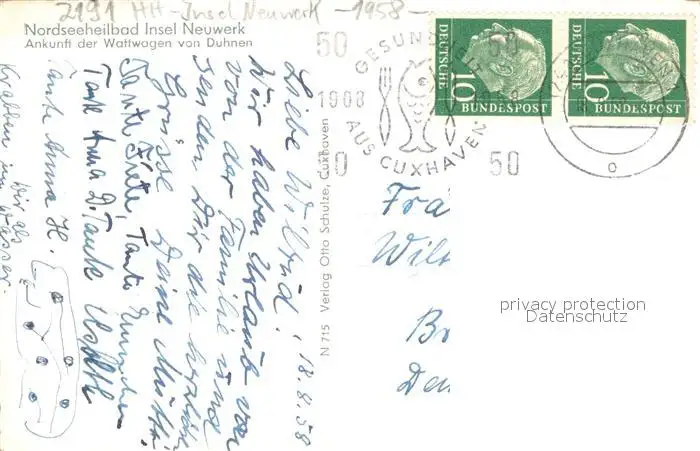 Neuwerk_Cuxhaven_Nordseebad Nordseeheilbad Insel Ankunft der Wattwagen von Duhnen Neuwerk_Cuxhaven postalisch gelaufen 1958 Erhaltung siehe scans [LiesaD40] LiesID40