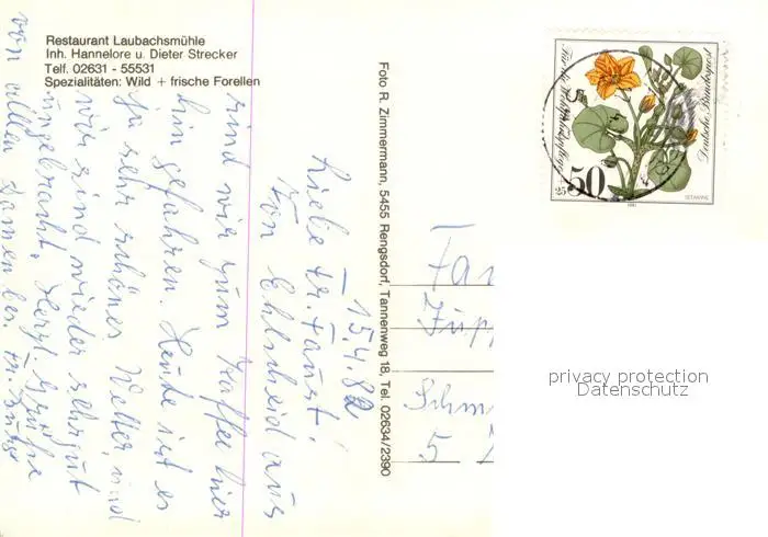 Neuwied_Rhein Restaurant Laubachsmuehle im Wiedbachtal Neuwied Rhein postalisch gelaufen 1982 Erhaltung siehe scans [FriedD77] Frierer