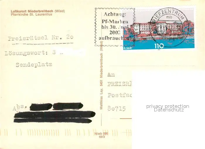 Niederbreitbach Pfarrkirche St. Lautentius Niederbreitbach postalisch gelaufen 2002 Erhaltung siehe scans [LiesaD40] LiesID40
