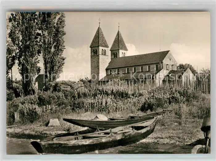 Niederzell_Reichenau St Peter und Paul Kirche Fischerhafen Fischerboot Niederzell Reichenau postalisch nicht gelaufen nach 1965 Erhaltung siehe scans [FriedD77] Frierer