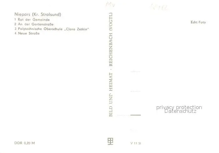 Niepars 700 Jahre Jubilaeum Rat der Gemeinde Gartenstrasse Polytechnische Oberschule Clara Zetkin Neue Strasse Niepars postalisch nicht gelaufen 1982 Erhaltung siehe scans [FriedD77] Frierer