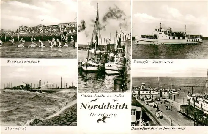Norddeich__Norden_Nordseebad Seebadeanstalt Sturmflut Fischerboote Hafen Dampfer postalisch nicht gelaufen 1921-1965 Erhaltung siehe scans [FriedD77] Frierer