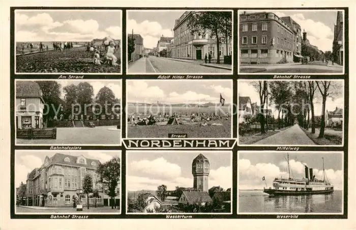 Nordenham A.H.-Strasse - Bahnhofstrasse - Strand - Wasserturm - Weserbild - Feldpost Nordenham postalisch gelaufen 1941 Feldpost auf Karte (Motiv) Erhaltung siehe scans [LiesaD40] Feldpost auf Karte (Motiv) LiesID40
