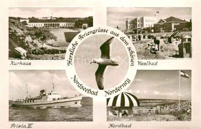 Norderney_Nordseebad Kurhaus Westbad Frisia IV Faehre Nordbad Strand Moewe Norderney_Nordseebad postalisch nicht gelaufen nach 1965 Erhaltung siehe scans [FriedD77] Frierer