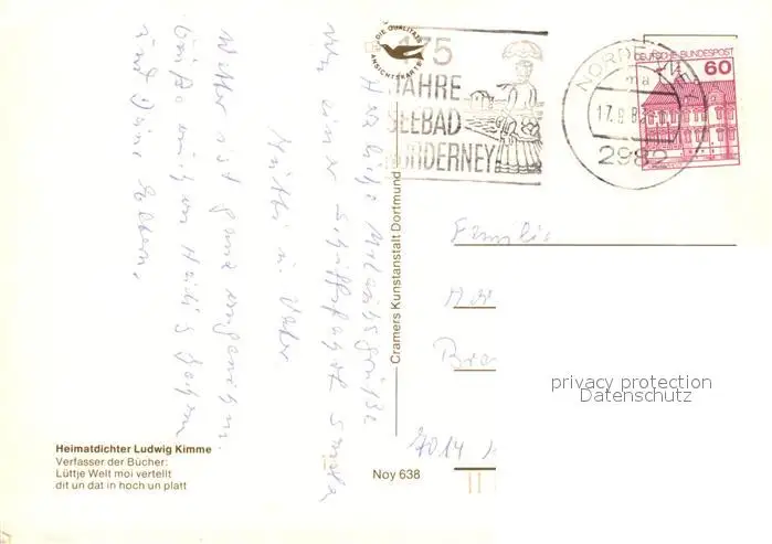 Norderney_Nordseebad Schwanenteich Strandstrasse Faehre Trinkkur Kirche Strand Jachthafen Napoleonschanze Luftbild Gedicht Ludwig Kimme Norderney_Nordseebad postalisch gelaufen 1983 Erhaltung siehe scans [FriedD77] Frierer
