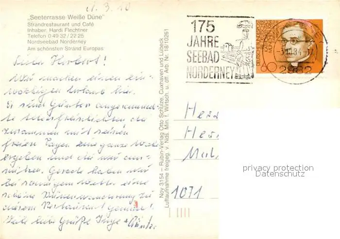Norderney_Nordseebad Strand Seeterrasse Weisse Duene Gastraum Norderney_Nordseebad postalisch gelaufen 1984 Erhaltung siehe scans [WerneD78] WernPID7