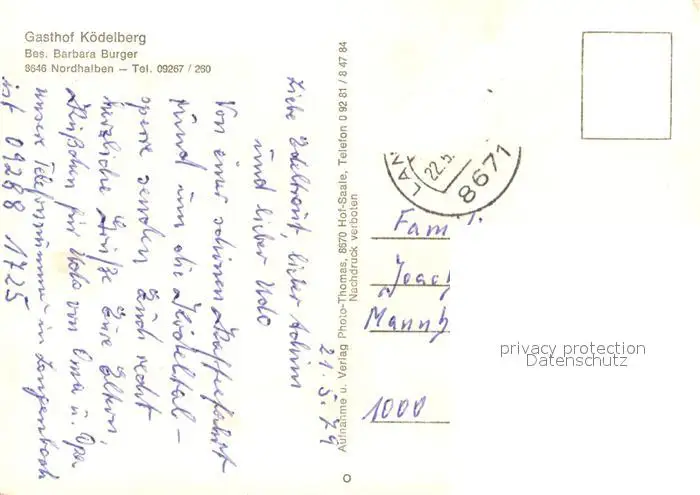 Nordhalben Gasthof Koedelberg an der Koedeltalsperre Stausee Nordhalben postalisch gelaufen 1979 Erhaltung siehe scans [FriedD77] Frierer