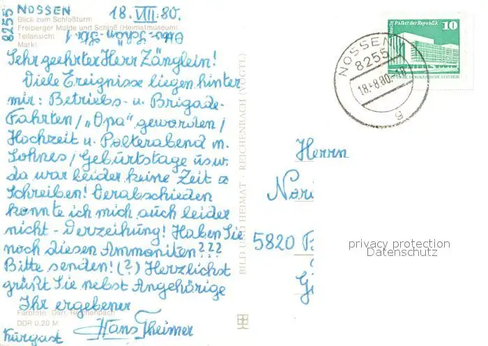 Nossen Blick vom Schlossturm Freiberger Mulde Schloss Heimatmuseum Markt Nossen postalisch gelaufen 1980 Erhaltung siehe scans [FriedD77] Frierer