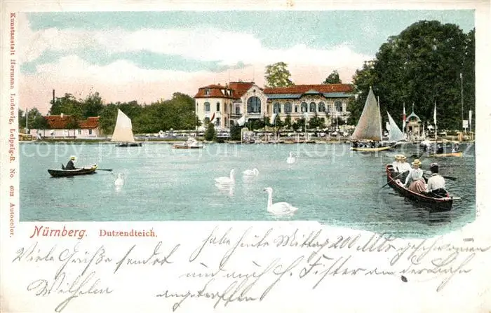 Nuernberg Dutzendteich Bootfahren Segeln Schwaene Nuernberg postalisch gelaufen 1903 Erhaltung siehe scans [FriedD77] Frierer