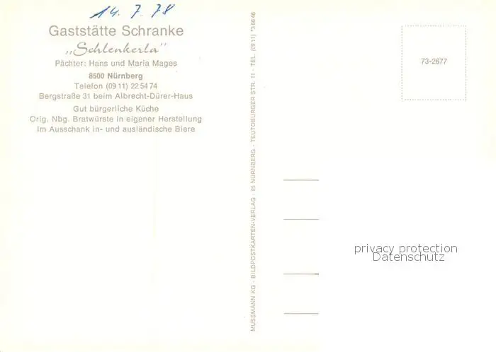 Nuernberg Gaststaette Schranke Schlenkerla Nuernberg postalisch gelaufen 1978 Erhaltung siehe scans [WerneD78] WernPID7