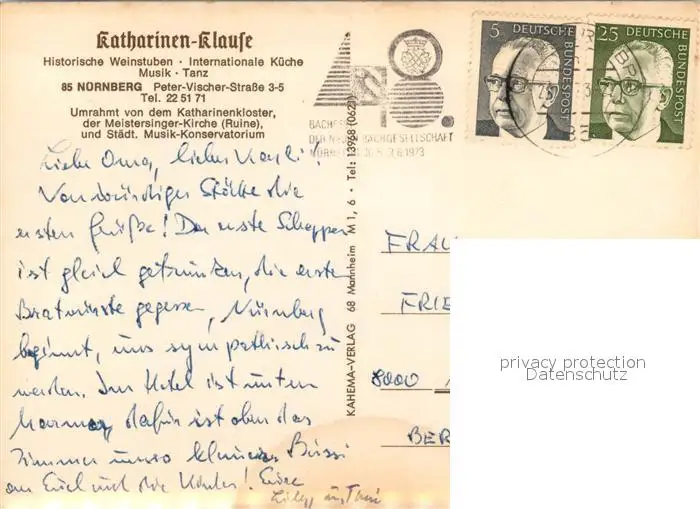 Nuernberg Weinstuben Katharinen Klause Restaurant Nuernberg postalisch gelaufen 1973 Erhaltung siehe scans [FriedD77] Frierer