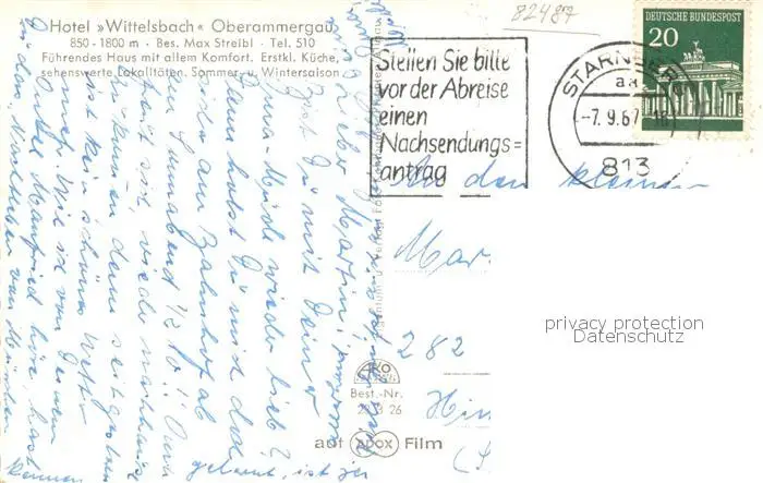 Oberammergau Hotel Wittelsbach Oberammergau postalisch gelaufen 1967 Erhaltung siehe scans [FriedD77] Frierer