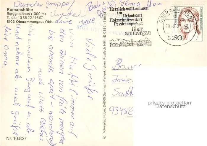 Oberammergau Romanshoehe Berggasthaus Alpen Oberammergau postalisch gelaufen 1993 Erhaltung siehe scans [FriedD77] Frierer