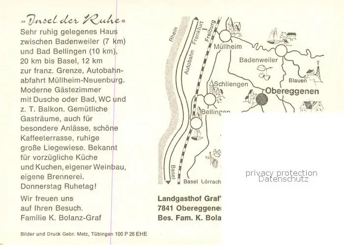 Obereggenen Landgasthof Grafs Weinstube Restaurant Landschaftspanorama Obereggenen postalisch nicht gelaufen nach 1965 Werbekarte (keine Postkarte) Erhaltung siehe scans [FriedD77] Werbekarte (keine Postkarte) Frierer