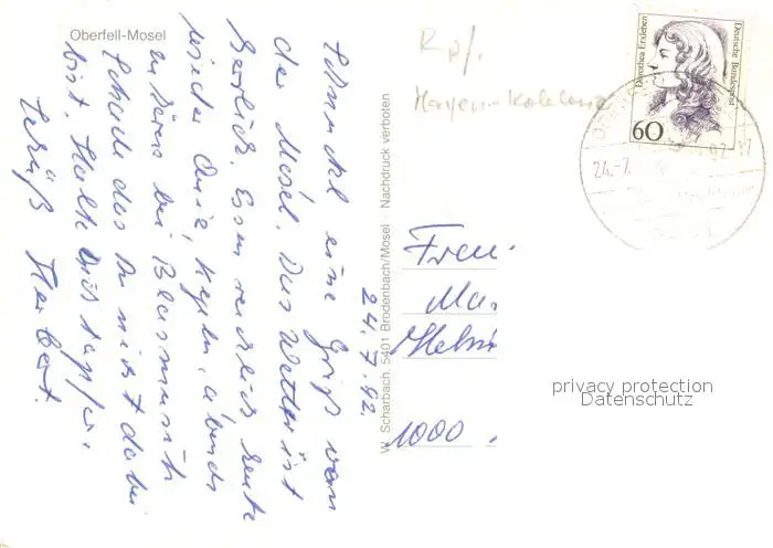 Oberfell Blick ueber die Mosel Segelboote Oberfell postalisch gelaufen 1992 Erhaltung siehe scans [FriedD77] Frierer