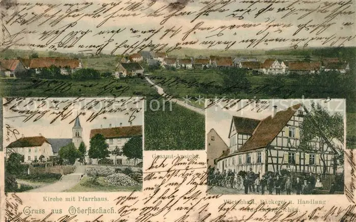 Oberfischbach_Grosserlach Kategorie Alte Ansichtskarten Postkarten bx80738 Oberfischbach_Grosserlach Kirche Pfarrhaus Wirtschaft Baeckerei Handlung Oberfischbach_Grosserlach postalisch gelaufen 1905 Erhaltung siehe scans [KathaD81]