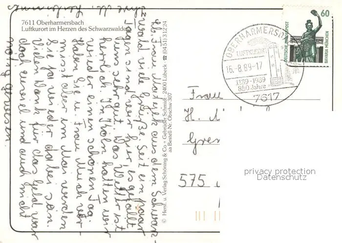 Oberharmersbach Ortsansicht mit Kirche Hauptstrasse Kurpark Luftkurort im Schwarzwald Oberharmersbach postalisch gelaufen 1989 Erhaltung siehe scans [FriedD77] Frierer