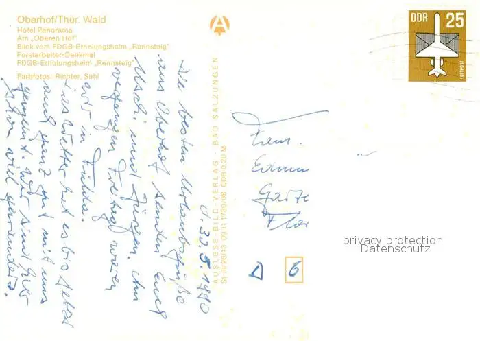 Oberhof_Thueringen Hotel Panorama Oberer Hof FDGB Erholungsheim Rennsteig Forstarbeiter Denkmal Oberhof Thueringen postalisch gelaufen 1990 Erhaltung siehe scans [FriedD77] Frierer
