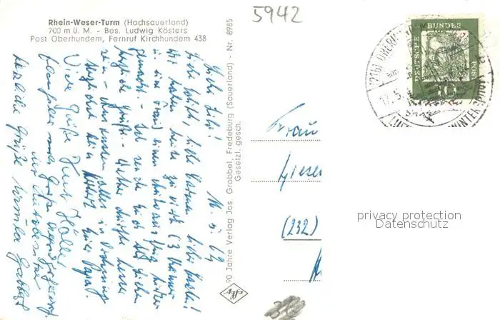 Oberhundem Rhein Weser Turm Landschaftspanorama Oberhundem postalisch gelaufen 1962 Erhaltung siehe scans [FriedD77] Frierer