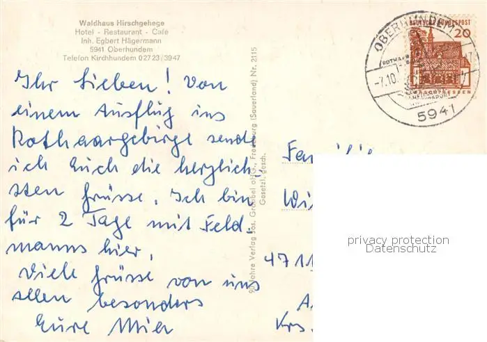 Oberhundem Waldhaus Hirschgehege Hotel Restaurant Oberhundem postalisch gelaufen nach 1965 Erhaltung siehe scans [WerneD78] WernPID7