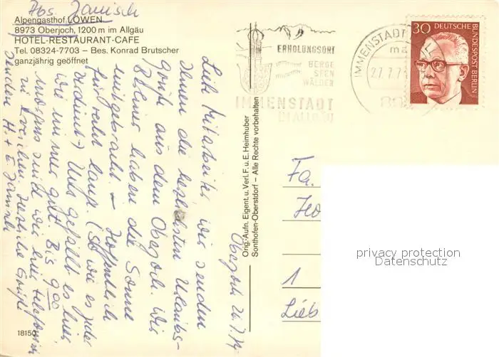 Oberjoch Alpengasthof Loewen Gastraeume Oberjoch postalisch gelaufen 1974 Erhaltung siehe scans [WerneD78] WernPID7