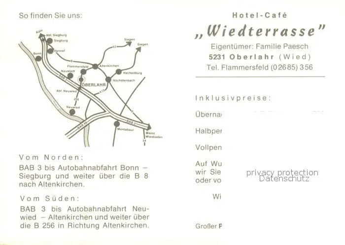 Oberlahr_Westerwald Hotel Cafe Wiedterrasse Oberlahr_Westerwald postalisch nicht gelaufen nach 1965 Werbekarte (keine Postkarte) Erhaltung siehe scans [KathaD81] Werbekarte (keine Postkarte) Kathoren