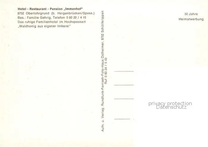 Oberlohrgrund Hotel Restaurant Pension Immenhof Oberlohrgrund postalisch nicht gelaufen nach 1965 Erhaltung siehe scans [FriedD77] Frierer