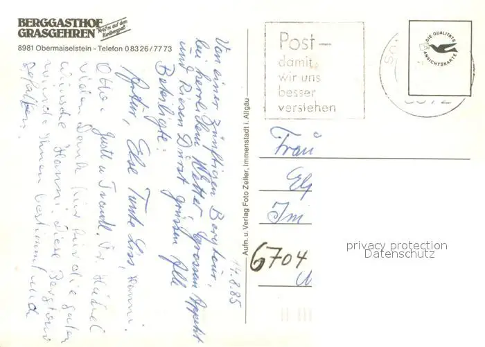 Obermaiselstein Berggasthof Grasgehren Terrasse Schlafraum Obermaiselstein postalisch gelaufen 1985 Erhaltung siehe scans [FriedD77] Frierer