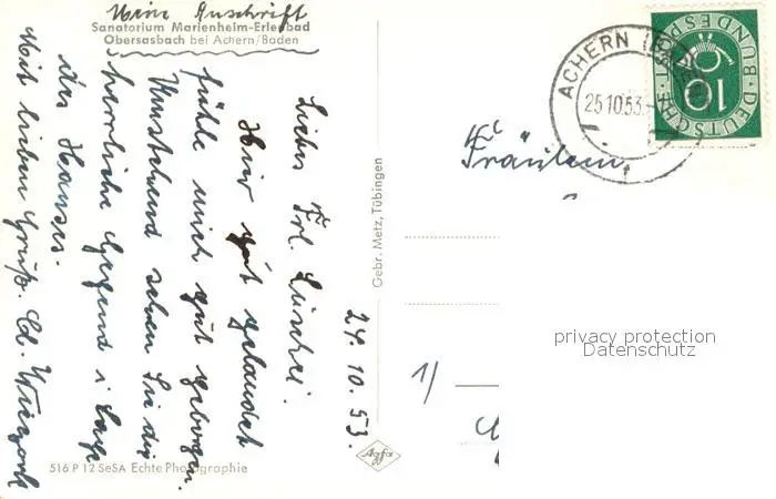 Obersasbach Sanatorium Marienheim Erlenbad im Schwarzwald Obersasbach postalisch gelaufen 1953 Erhaltung siehe scans [FriedD77] Frierer