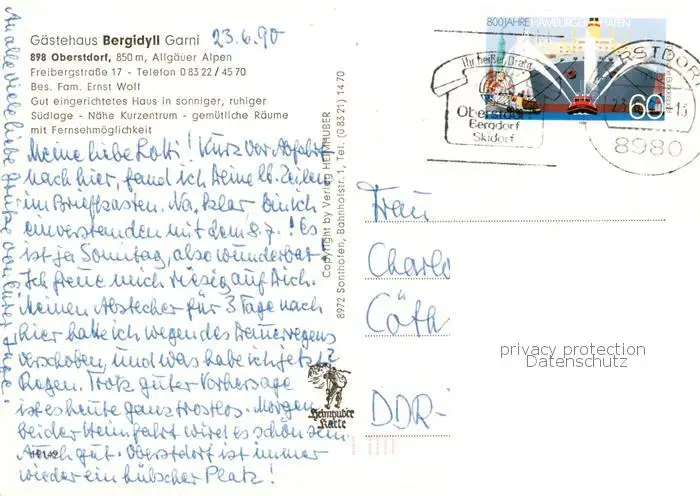 Oberstdorf Gaestehaus Bergidyll Gastraeume Gaestezimmer Panorama Alpen Oberstdorf postalisch gelaufen 1990 Erhaltung siehe scans [FriedD77] Frierer