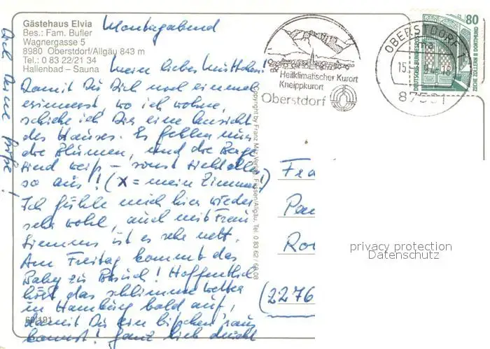 Oberstdorf Gaestehaus Elvia Oberstdorf postalisch gelaufen 1994 Erhaltung siehe scans [WerneD78] WernPID7