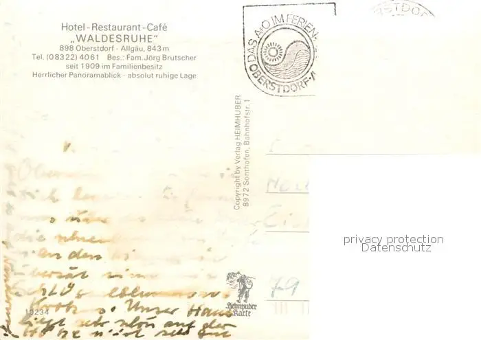 Oberstdorf Hotel Restaurant Cafe Waldesruhe Oberstdorf postalisch nicht gelaufen nach 1965 Erhaltung siehe scans [WerneD78] WernPID7