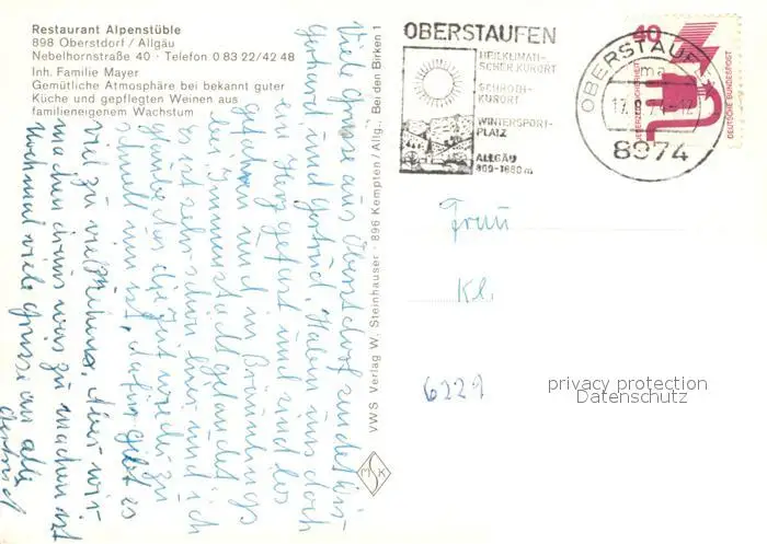Oberstdorf Restaurant Alpenstueble Oberstdorf postalisch gelaufen 1974 Erhaltung siehe scans [FriedD77] Frierer