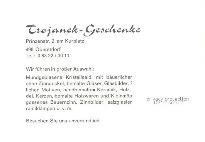 Oberstdorf Trojanek Geschenke Ladengeschaeft Oberstdorf postalisch nicht gelaufen nach 1965 Werbekarte (keine Postkarte) Erhaltung siehe scans [FriedD77] Werbekarte (keine Postkarte) Frierer