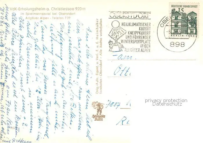 Oberstdorf VdK Erholungsheim Christlessee Gastraeme Seepartie Oberstdorf postalisch gelaufen 1965 Erhaltung siehe scans [FriedD77] Frierer