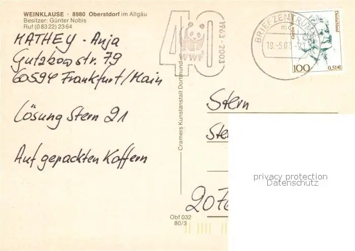 Oberstdorf Weinklause Gastraeume Oberstdorf postalisch gelaufen 2003 Erhaltung siehe scans [FriedD77] Frierer