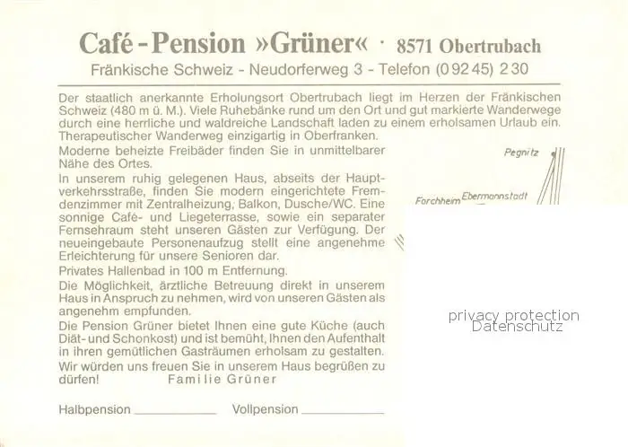 Obertrubach Café Pension Gruener Obertrubach postalisch nicht gelaufen nach 1965 Werbekarte (keine Postkarte) Erhaltung siehe scans [FriedD77] Werbekarte (keine Postkarte) Frierer