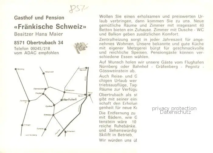 Obertrubach Gasthof Pension Zur Fraenkischen Schweiz Gastraeume Zimmer Obertrubach postalisch nicht gelaufen nach 1965 Werbekarte (keine Postkarte) Erhaltung siehe scans [FriedD77] Werbekarte (keine Postkarte) Frierer