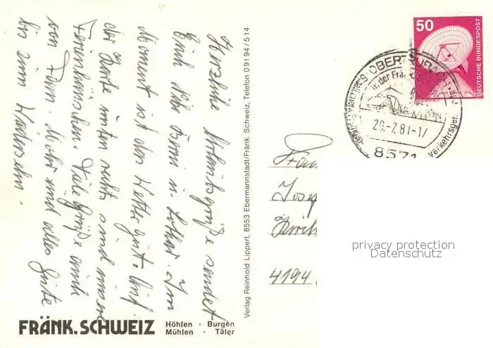 Obertrubach Naturpark Fraenkische Schweiz Details Obertrubach postalisch gelaufen 1981 Erhaltung siehe scans [WerneD78] WernPID7