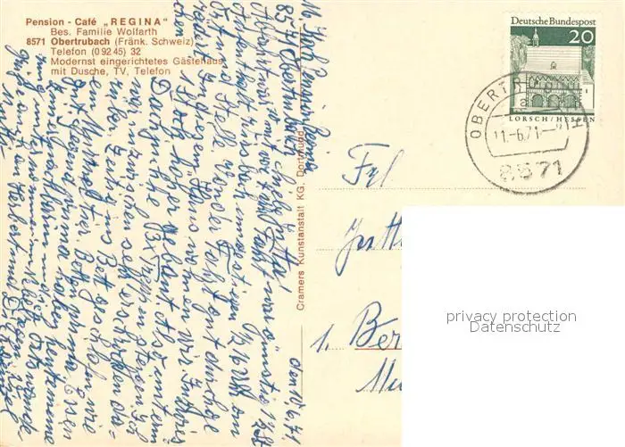 Obertrubach Pension Caf? Regina Obertrubach postalisch gelaufen 1971 Erhaltung siehe scans [LiesaD40] LiesID40